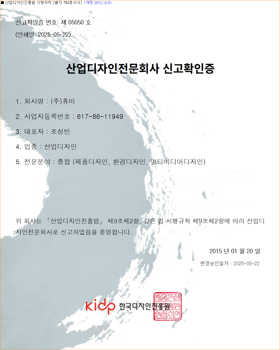 산업디자인전문회사 신고확인증(종합)